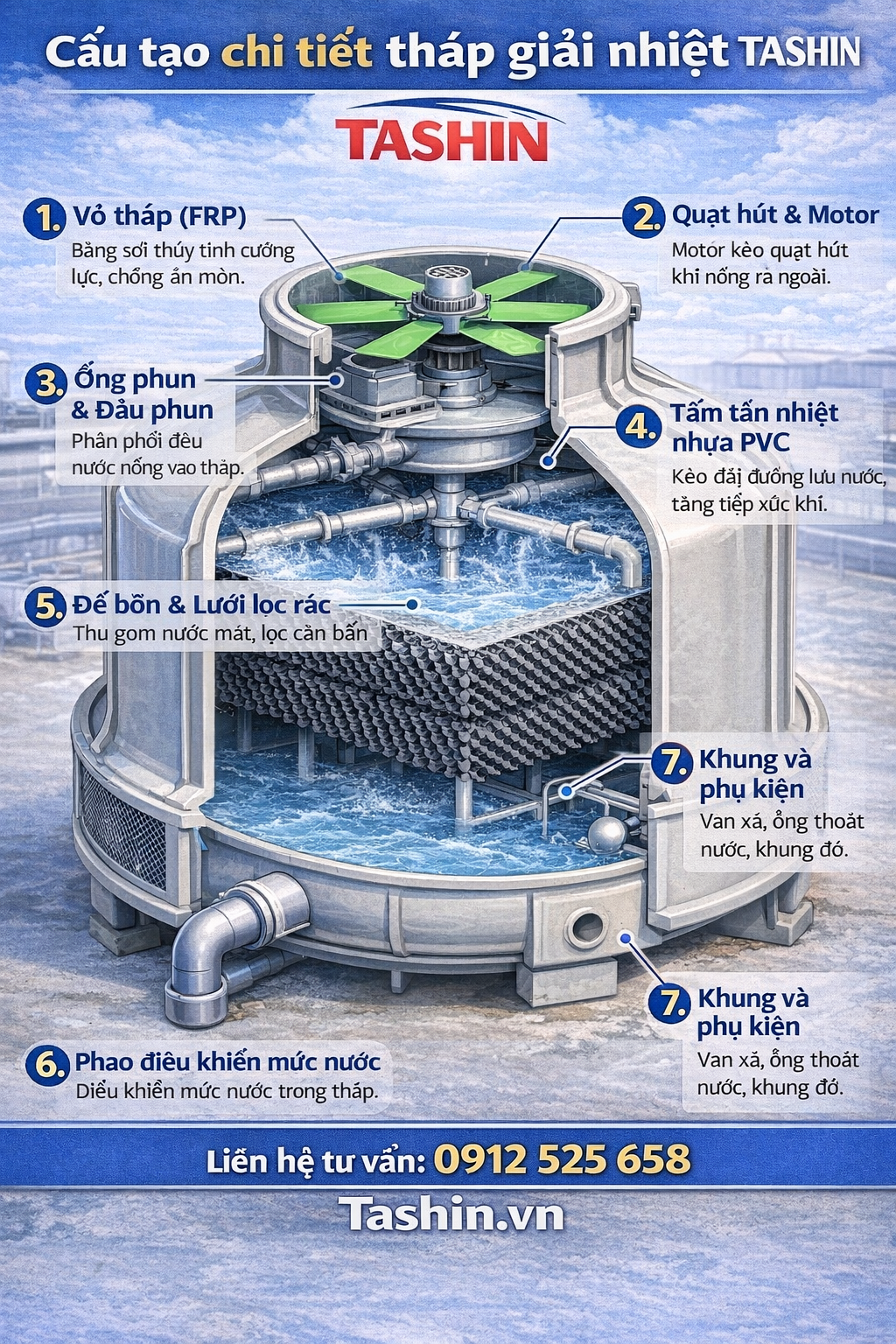 Tháp giải nhiệt Tashin là một hệ thống làm mát hiệu quả với cấu tạo khoa học và nguyên lý hoạt động dựa trên trao đổi nhiệt tự nhiên. Việc hiểu rõ cấu tạo và nguyên lý hoạt động của thiết bị sẽ giúp người sử dụng: