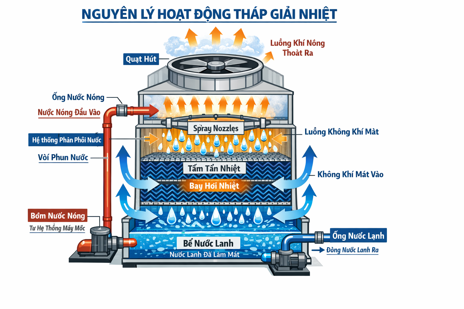 - **Hệ thống ống dẫn và bơm:** Đưa nước lạnh quay trở lại phục vụ sản xuất và đưa nước nóng trở lại tháp.